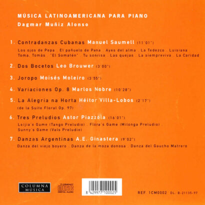 La pianista Dagmar Muñiz interpreta obres de grans compositors llatinoamericans com Saumell, Brouwer, Moleiro, Villa-Lobos, Piazzolla i Ginastera. Un recorregut vibrant per les textures i ritmes d’Amèrica Llatina amb un toc clàssic i expressiu.