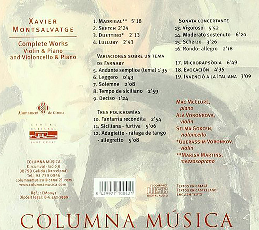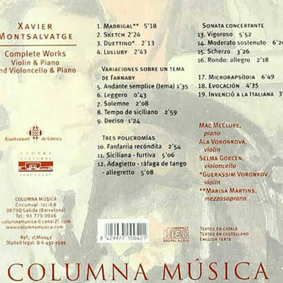 Aquest disc presenta la integral de les obres de Xavier Montsalvatge per a violí i piano i violoncel i piano. La música de Montsalvatge, figura clau del segle XX català, combina lirisme, modernitat i influències del món hispànic i caribeny. Aquest enregistrament ofereix una visió completa i rica del seu univers de cambra, on el piano dialoga amb cordes amb sensibilitat i força expressiva.