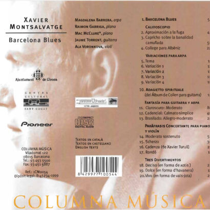 Barcelona Blues ens presenta una faceta menys coneguda del compositor català Xavier Montsalvatge, amb obres que dialoguen entre el llenguatge clàssic i les influències del jazz i el blues. A través d’una combinació poc convencional de piano, arpa i guitarra, aquesta gravació ofereix una mirada original i delicada a l’obra de cambra del compositor. Una proposta íntima i refinada, interpretada per la pianista M. MacClure.