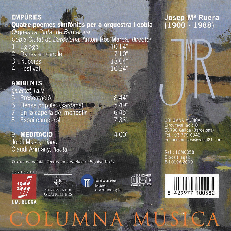 Aquest disc presenta tres obres emblemàtiques del compositor Josep M. Ruera: Empúries, Ambients i Meditació, que reflecteixen el seu llenguatge líric i paisatgístic. Amb una escriptura acurada per a piano i flauta, i l’acompanyament orquestral de l’OBC sota la direcció de Salvador Brotons (o Ros Marbà, segons font), aquestes peces evoquen l’essència de la natura i la sensibilitat mediterrània.