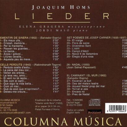Aquest disc recull una selecció de lieder de Joaquim Homs, una de les figures clau de l’avantguarda musical catalana del segle XX. Amb text i música profundament expressius, les obres són interpretades amb gran sensibilitat per Elena Gragera i el pianista Jordi Masó. Un enregistrament essencial per a conèixer la vessant més íntima i lírica d’un compositor sovint associat amb la música instrumental i l’experimentació sonora.
