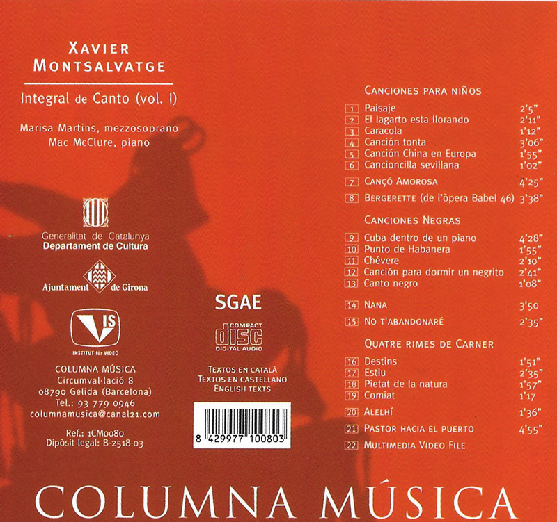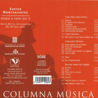 Integral de Cant– Vol. I, continua el recorregut per l’obra vocal completa de Xavier Montsalvatge, un dels compositors més influents de la música catalana del segle XX. En aquest volum, la mezzosoprano Marisa Martins interpreta amb elegància i profunditat una selecció de cançons que mostren la riquesa expressiva i la diversitat estilística de Montsalvatge, des del lirisme intimista fins a les influències caribenyes i modernes.