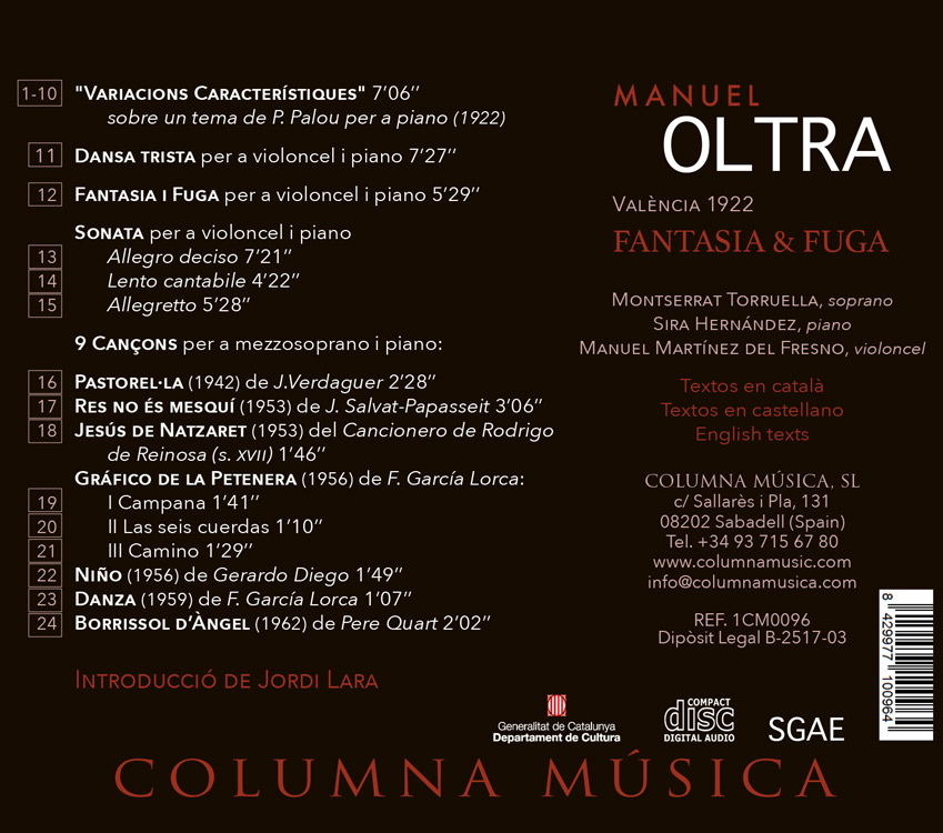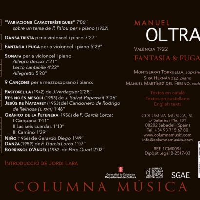 Fantasia & Fuga de Manuel Oltra és una obra per a violoncel i piano i cant i piano, concebuda com un homenatge a la forma clàssica. Amb un llenguatge musical refinat i profundament emotiu, Oltra ens ofereix una peça amb un gran valor expressiu i tècnic, ideal tant per a concerts com per a enregistraments de música de cambra contemporània.