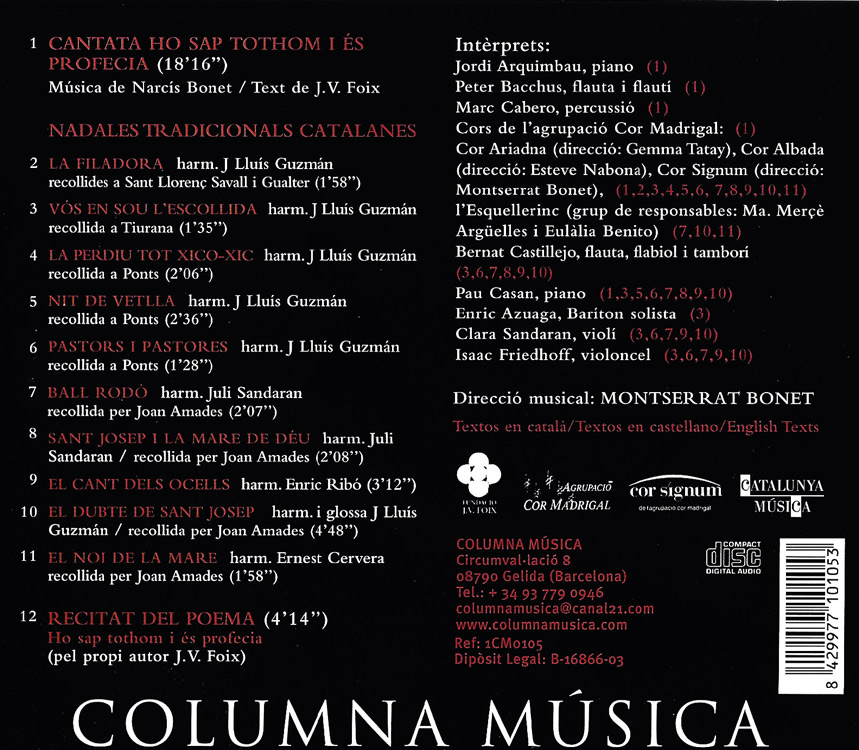Compositors: Narcís Bonet (1933-2019) (música) – J. V. Foix (1893-1987) (text), Tradicionals harmonitzades per: J. L. Guzmán, J. Sandaran, E. Ribó, E. Cervera,