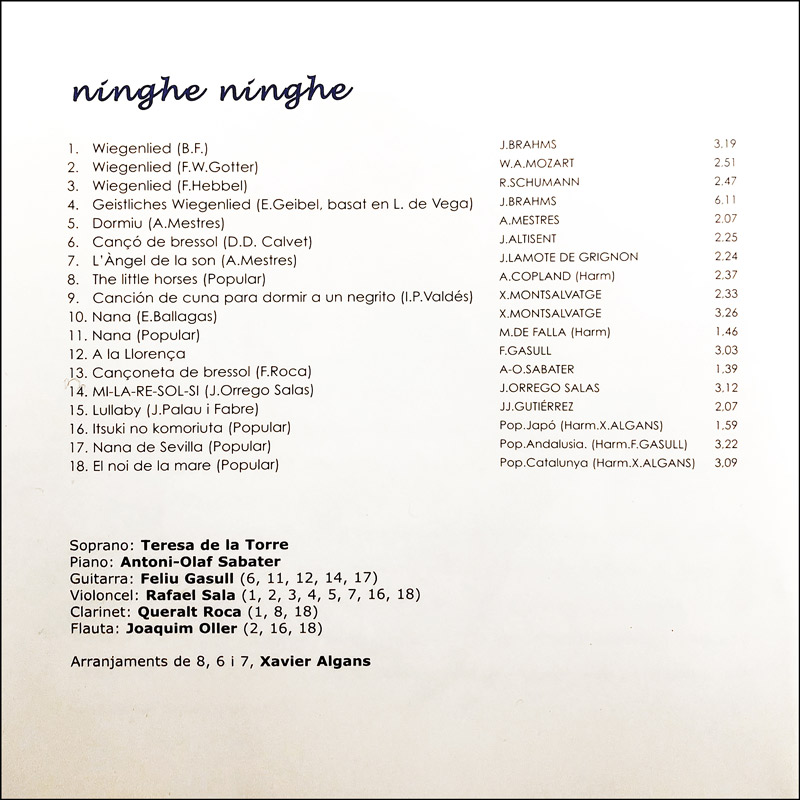 Intèrprets: Teresa de la Torre – veu, Antoni-Olaf Sabater – piano, Feliu Gasull – guitarra, Rafael Sala – violoncel, Queralt Roca – clarinet, Joaquim Oller – flauta