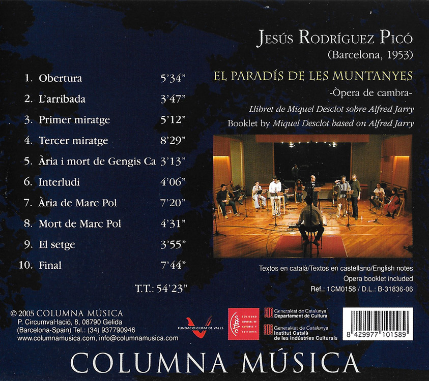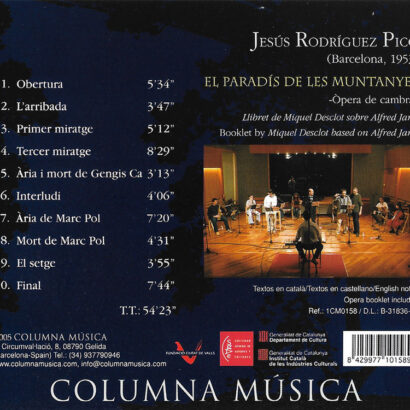 El paradís de les muntanyes és una òpera de cambra composta per Jesús Rodríguez Picó, amb llibret del poeta Miquel Desclot, que combina dramatúrgia moderna amb una sonoritat contemporània rica i expressiva. Amb una plantilla vocal i instrumental reduïda però molt potent, l’obra explora temes humans i poètics a través d’un llenguatge musical intens i evocador. Una peça essencial del repertori líric contemporani català.