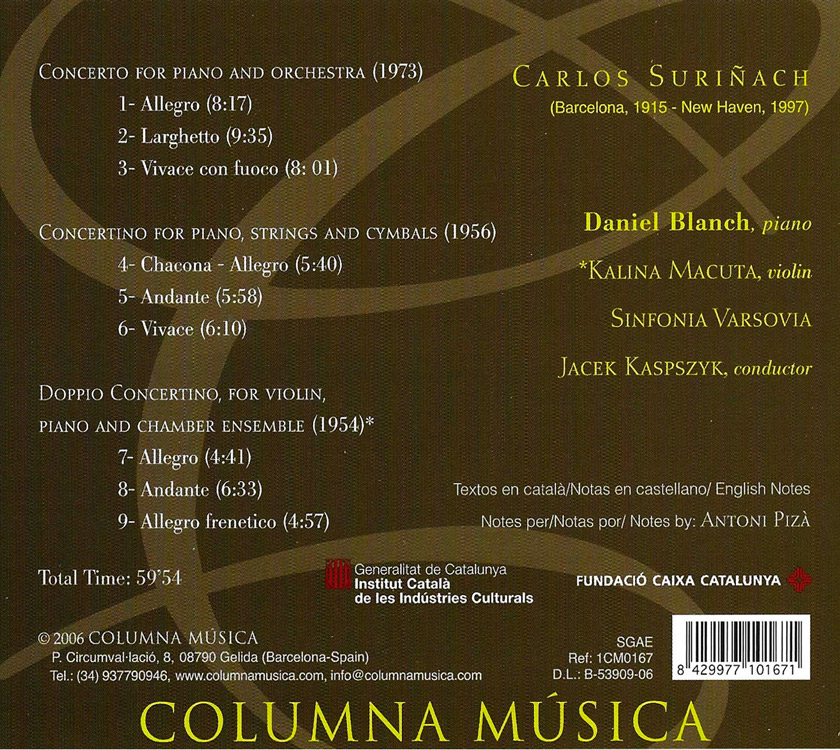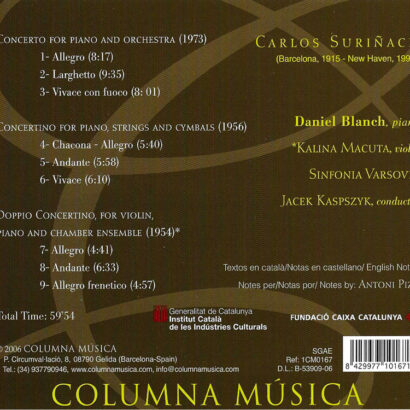 Aquest enregistrament presenta el vibrant “Concierto para piano” del compositor Carlos Suriñach, una obra intensa i enèrgica que combina les influències del folklore espanyol amb l’estètica moderna del segle XX. Interpretat pel reconegut pianista Daniel Blanch, acompanyat per la violinista Kalina Macuta i la prestigiosa orquestra Sinfonia Varsovia, aquest disc ofereix una experiència sonora rica i emocional. Ideal per a amants de la música clàssica contemporània i les sonoritats orquestrals amb caràcter hispànic.